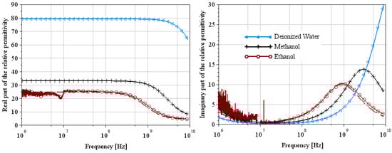 Figure 1 shows the real and imaginary parts of the relative permittivity of the reference liquids derived from Equation (1) and using the parameters given in Table 1 and Table 2. This theoretical modeling will later be used to compare our extractions. Note that for liquids with low conductivity (as ethanol, methanol, or deionized water), its impact on the imaginary part of permittivity operates at frequencies below 1 MHz. For tap water, this impact extends up to 10 MHz.