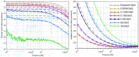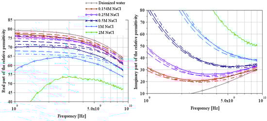 The complex relative permittivities of NaCl water solutions extracted by both methods are shown in Figure 6 and Figure 9. Solid lines are from measurements (T = 22 °C), and the other curves are from theoretical Equation (2) with a dashed line for a temperature of 20 °C and a dash-dotted line for a temperature of 25 °C (using Table 4 parameters).