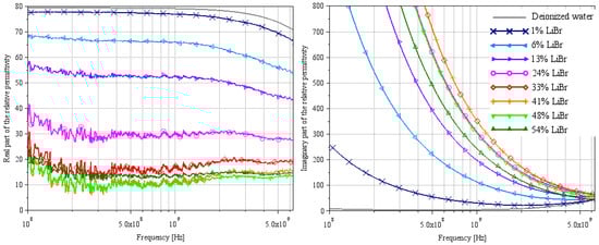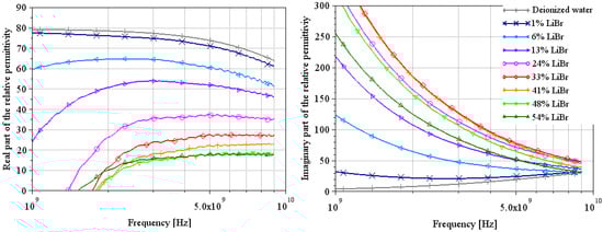 As regards the imaginary part of the permittivity, we can see that it varies strongly with LiBr concentration, with a reversal of the direction of variation for LiBr mass concentrations between 33 and 41%. This is in line with what was predicted in Figure 1 and in agreement with generic Equations (1) and (2): the decrease in conductivity for solutions with concentrations above 35% is reflected in the imaginary part of the permittivity.