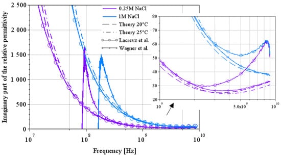 Comparison between the two extraction methods and theoretical results on the imaginary part of the complex permittivity for NaCl water solutions [,].
