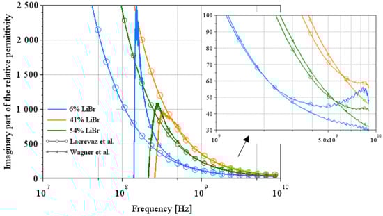 In Figure 11, we can see a complementarity in their area of validity. Indeed, Lacrevaz’s method gives consistent results from low frequencies up to a few GHz; when results diverge from theory, Wagner’s method becomes consistent. The same behavior can be seen in the results for LiBr water solutions in Figure 12. A summary of the values of the imaginary part of the permittivity of LiBr water solutions is given in Table 8. The last line of this table shows the percentage change in the imaginary part of the permittivity for LiBr mass concentrations ranging from 41% to 54%. The imaginary part of the permittivity reaches a variation of 37% (calculated by dividing the difference between its two extreme values by the central value) over a wide frequency band: from 10 MHz to almost 9 GHz. The development of a sensor detecting variations in the imaginary part of permittivity (or the conductivity) at a particular frequency within this frequency range is, therefore, conceivable.