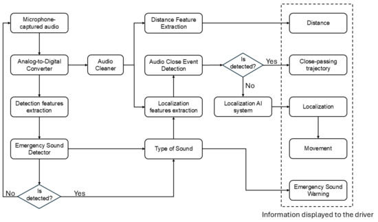 Addressing the limitations and gaps identified in the state-of-the-art, this study presents the development of an accessible and practical system for real-world applications, particularly within the automotive environment, and its integration with Advanced Driver Assistance Systems (ADAS) [31]. The system is designed to accurately identify and localize emergency sounds, providing the driver with a clear visual reference of the sound’s direction and proximity. The system’s ease of use and effectiveness are critical for ensuring quick decision-making without distracting the driver from the road.