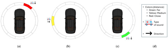 Examples of acoustic environment representation on the onboard computer: (a) siren approaching from a short distance at approximately 30°; (b) siren approaching from a medium distance at approximately 270°; (c) siren moving away from a long distance at approximately 150°; (d) color-coded proximity indicators with symbol explanations, including the type of sound and estimated movement direction.