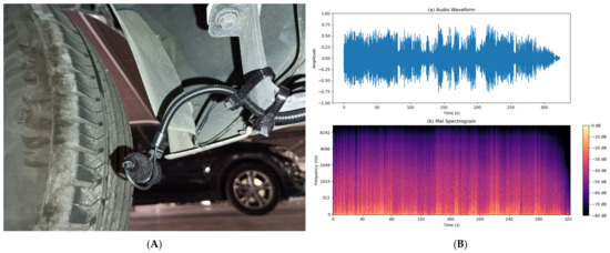 The effectiveness of any detection AI-based system fundamentally depends on the quality of its input signals [32]. Wind and vibration noise contamination of audio signals represents one of the most challenging problems in sound capture systems for vehicles in motion. This phenomenon was identified during the initial tests conducted with the first setup for road sound recording (shown in Figure 3A), where it was observed that the airflow over the microphones generated a constant and intense environmental noise. After recording the signals captured under road conditions, a detailed analysis of the measurements was performed. These analyses revealed that wind introduces significant interference in the frequency spectrum, which is expected to complicate detection and drastically reduce the accuracy of localization systems. In particular, wind noise masks critical informational frequencies in emergency sounds and generates artifacts in the audio that may hinder the optimal functioning of AI algorithms designed to identify and localize emergency sounds in real-time, as can be seen in Figure 3B.