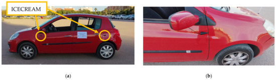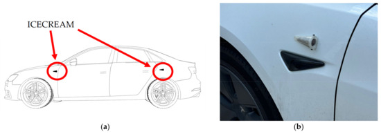 Real design of ICECREAM: (a) sketch of the lateral placement position of ICECREAM on the vehicle; (b) ICECREAM mounted on the vehicle.