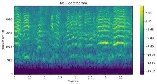 The Mel spectrogram is generated using 128 Mel filters, a 32 ms analysis window (defined by the size of the Fourier transform, nfft), and a hop length of 10 ms, ensuring an appropriate temporal resolution to capture the dynamics of emergency sounds. These configurations balance both temporal and frequency resolution, allowing for a detailed representation of the acoustic content within the analyzed segments. As a result, a spectrogram is obtained, such as the one shown in Figure 7, which serves as input to the detection model.