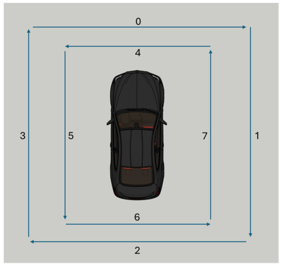 At the output of the ResNet, classification layers are added, consisting of a fully connected (fc) layer followed by a ReLU activation, a dropout layer to prevent overfitting, and a final classification layer with softmax to obtain the probability for each class. In this case, this first branch is configured to classify among 8 possible classes, corresponding to the 8 different possible close-passing sound trajectories, labeled from 0 to 7, as shown in Figure 10. These classifications are based on the temporal and spatial data collected by microphones.