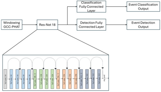 Once the GCC-PHAT features are obtained, they are fed into an artificial intelligence model based on residual convolutional neural networks (ResNet) [43], specifically the ResNet-18 version [43]. ResNet networks are widely known for their ability to learn deep representations of complex data, thanks to their skip connection structure. These connections allow relevant features to be efficiently transmitted through the network without losing information, which is essential for the processing of precise acoustic signals, such as those handled in this system. Additionally, ResNet-18 does not use max pooling layers between the convolutional layers, a common practice in this type of analysis, allowing the system to work with smaller matrices, like those generated by the GCC-PHAT calculation, without losing important details during the learning process.