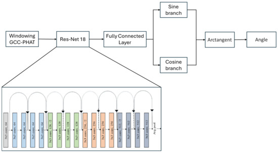 The goal is to predict the angle of arrival of the sound based on the features extracted from the microphones. The process begins with the ResNet-18 network, which extracts the relevant features from the spectrogram. These features are then passed to the two parallel branches, where each branch generates an output related to a trigonometric component of the angle: cosine and sine. Each branch consists of a fully connected layer with 512 neurons, followed by a PReLU activation, and then a single neuron layer with a Tanh activation function to map the output to continuous values in the range of −1 to 1, as the sine and cosine values of angles lie within this range, as shown in Figure 12.