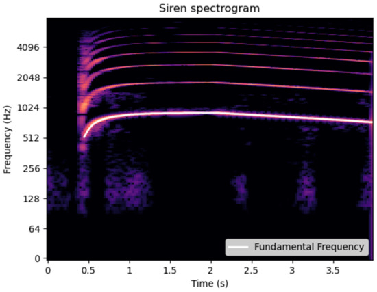 The proposed approach employs the YIN algorithm [47,48,49] to identify the fundamental frequency of the signal, leveraging prior knowledge about the nature of siren sounds. This algorithm, applied over a specific frequency range, allows for precise determination of the fundamental frequency, as shown in Figure 13. Since the signals are already cleaned after passing through the denoising block described in Section 4.2, the fundamental frequency detected by the algorithm is inherently that of the emergency sound. From this fundamental frequency, the corresponding harmonic frequencies are extrapolated, and the energy of each harmonic is then calculated.