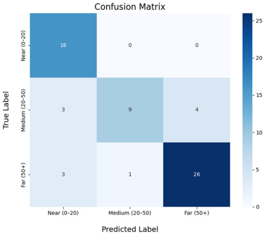 After applying the harmonic comparison algorithm and these defined thresholds, the system achieved an accuracy of 82.26%, with the confusion matrix shown in Figure 29. The defined distance ranges—close (0–20 m), medium (20–50 m), and far (greater than 50 m)—are considered optimal as they provide the driver with a clear and actionable interpretation of the emergency vehicle’s proximity. This enables fast and effective decision-making to enhance road safety.