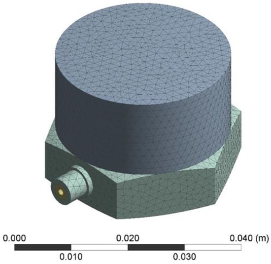 Before the finite element analysis, a three-dimensional model of the sensor was established with Solidworks2022 software. The three-dimensional model was simplified to enhance mesh division quality. When the model is solved, the system automatically establishes the contact area. The results after meshing are shown in Figure 4, including 40,948 elements and 108,509 nodes.