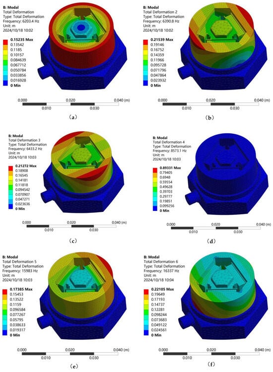 Figure 5 illustrates that the initial mode shape deformation predominantly affects the components near the central column. The second and third mode shapes exhibit orthogonal deformation directions, primarily located at the bottom of the central pillar, with similar deformation magnitudes. When the fourth mode shape is adopted, there is no deformation inside the sensor. The fifth mode shape is deformed at the upper position of the mass block, and the sixth mode shape is deformed at the lower position of the mass block. The sensor is deformed during the first mode shape, which affects the monitoring of the signal; in this paper, the first-order mode of the sensor is taken as the resonance frequency of 6203.4 Hz.