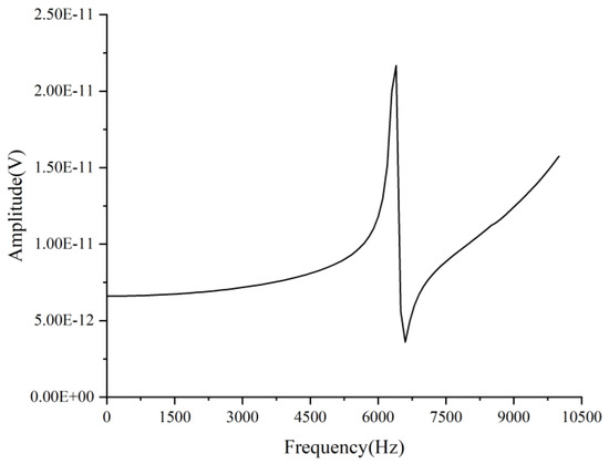 Theoretically, the resonant frequency response curve should be distorted at the resonant frequency. The harmonic response analysis employs a sinusoidal signal to excite and assess the frequency response within the 0 to 10 kHz range, using an interval of 200 points, corresponding to a frequency band of 50 Hz each [26]. When the damping coefficient is less than 0.1, the natural frequency is basically the same as the resonant frequency, and the optimal damping coefficient of 0.01 should be taken as the target in the solution [27]. Figure 6 presents the results. Before reaching one-third of the sensor’s resonant frequency, the frequency response curve approximates a straight line, indicating that the sensor’s sensitivity remains undistorted, which is beneficial for the sensor’s operation. After one-third of the resonant frequency, the frequency response curve exhibits fluctuations in amplitude, with the maximum amplitude occurring at the resonant frequency (6203.4 Hz), at which point the distortion reaches its highest level. Consequently, the sensor operates stably within a frequency range of 0 to 2067.8 Hz.