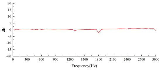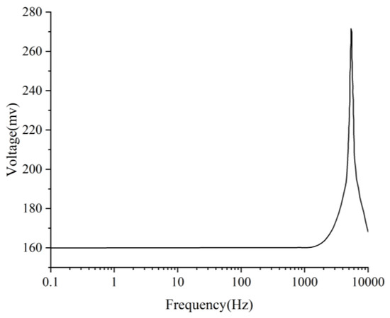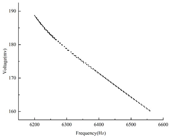 The relationship between the output voltage of the piezoelectric plate and frequency under a 1 g load is shown in Figure 8. Within the 0~2067.8 Hz range, the sensor’s voltage output remains stable. The voltage sensitivity of the sensor, as determined by Equation (12), is 159.23 mV/g.