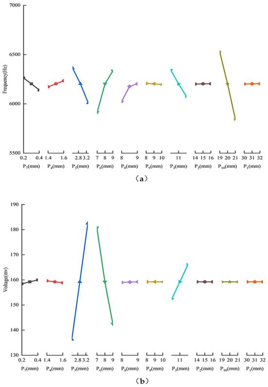 The influence of different structural parameters on optimization objectives. (a) The influence of each dimension parameter on the resonant frequency; (b) The influence of each dimension parameter on the voltage value.