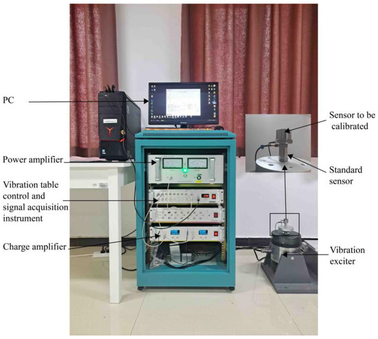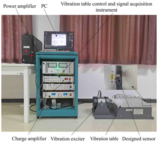 Based on the optimization results, a prototype of the sensor was made. Through the calibration experiment, the technical indicators such as the sensitivity and operating frequency of the piezoelectric sensor are obtained, and the test device for the calibration experiment is built, as shown in Figure 11. The system consists of a computer, vibration table control, signal collector, power amplifier, vibration exciter, standard sensor, sensor for calibration, and charge amplifier. During the calibration experiment, continuous signal sampling was performed with the standard and test sensors mounted back-to-back on the exciter. Shielded cables were employed to minimize noise interference during the calibration experiment.