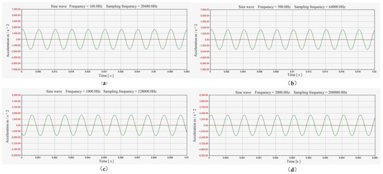 The exciter’s operating frequency was restricted to 0~3000 Hz due to experimental equipment limitations. The selected test vibration frequencies were 160 Hz, 500 Hz, 1000 Hz, and 2000 Hz. The resulting output curves from the test are shown in Figure 12.