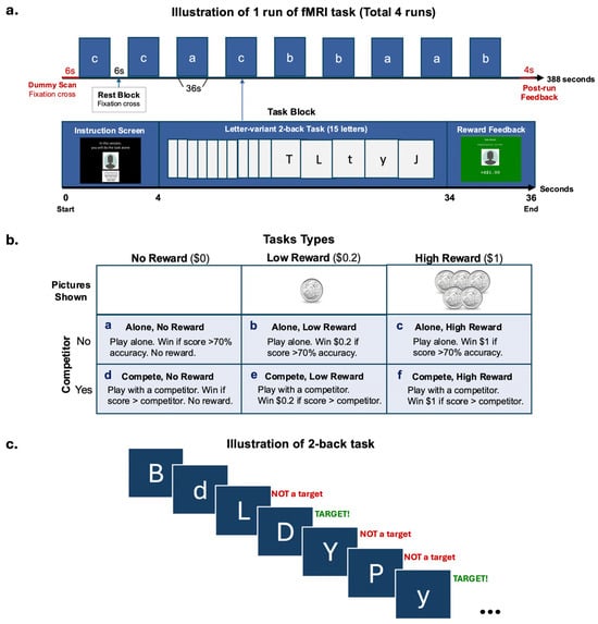 The participants took part in a competition- and reward-based letter-variant 2-back game. The game was designed to examine how (1) the magnitude of monetary reward and (2) the participation in a social competition, might affect the participants’ performance on a working memory (Cool EF) task and their corresponding brain activation. In the game, the participants were shown a series of letters, one at a time, on the screen. They were asked to indicate, starting from the third letter, whether the letter on screen was the same as the one presented two letters back. Both uppercase and lowercase letters were shown to engage the participants’ attention. However, the correct response was case-insensitive, where the letter “p” was considered the same as the letter “P” (Figure 1c). The participants performed the 2-back task under two conditions: playing alone or with a competitor. Each condition consisted of three types of trials (no-, low-, and high-reward), administered in a blocked design (Figure 1b). The participants completed two runs of each condition (approximately 6.5 min per run) for a total of four runs.