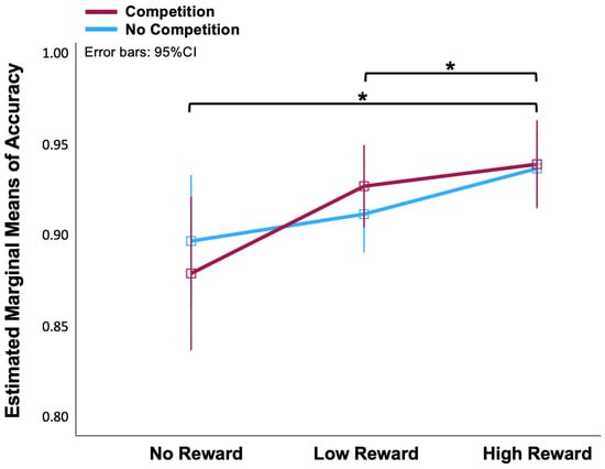 Line chart of means of accuracy in No-, Low-, High-Reward and No-Competition, Competition conditions. * The mean difference is significant at p < 0.05 (Bonferroni corrected for multiple comparisons).