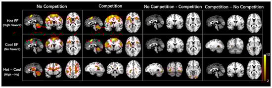 Interestingly, although no differences were found between competition and no-competition under hot or cool EF, we discovered significant clusters in no-competition versus competition condition in Hot–Cool EF after incorporating the reward condition. These clusters were located in the bilateral occipital gyrus, fusiform gyrus, and lingual gyrus. When examining the pure reward effect of the brain, we found greater activation in the “no competition” trials compared to the competition trials in both the right and left occipital gyrus, fusiform gyrus, and lingual gyrus. These regions were associated with higher visual processing and reading [,,], which would be expected due to the letter stimuli used in our 2-back task. The absence of a competitor in the “no competition” trials may have allowed the participants to focus more on processing stimuli during the task, consistent with a previous study [].