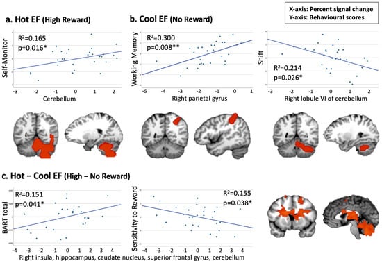 When testing the correlation between hot EF and Emotional Control and Self-Monitor, our findings revealed a positive association between a cerebellum cluster under the hot EF condition and the Self-Monitor scale (p = 0.016, corrected for multiple comparisons, Figure 4a). When examining Cool EF regions to be related to Working Memory, Shift, or Inhibit, we observed a significant positive correlation between a cluster in the right parietal gyrus and the Working Memory scale (p = 0.008, corrected for multiple comparisons). Additionally, a negative trend was found between a cerebellum cluster and the BRIEF-A Shift scale (Figure 4b). For the Hot–Cool EF condition, we identified two trends in cluster 1 (including the right insula, hippocampus, and superior frontal gyrus) which demonstrated a positive correlation with the BART score and a negative correlation with sensitivity to reward (Figure 4c).