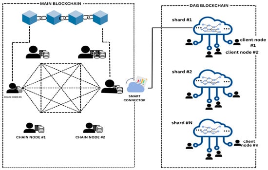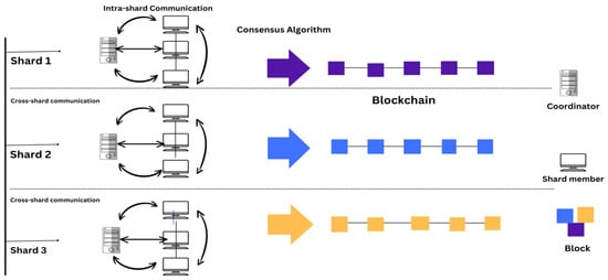 The increased adoption of the IoT has made it an appealing technology, which has been adopted within various businesses, industries, healthcare providers, and other departments. The IoT has significantly focused on gathering and exchanging data []. Similarly, IoT sensors are also helpful in environmental monitoring as they work by gathering data and measurements from the physical environment by utilizing connected devices and sensors. With the help of these sensors, temperature, moisture, leaks, water levels and other physical properties of tanks, pipelines, industrial equipment, oceanic applications, and irrigation systems can be determined. Furthermore, blockchain technology is considered one of the advanced mechanisms that enables the sharing of information transparently, particularly within a specific business network []. With the help of the IoT, devices across the internet are capable of sending data to blockchain network technology, which significantly results in creating tampered-resistant records of all the shared transactions. This is considered important in blockchain network technology, as it involves a distributed ledger system that records all the transactions securely and transparently. Moreover, the sent data are stored and encrypted in an unchangeable manner so that they cannot be manipulated, ensuring the transaction’s security and integrity and making it tamper-resistant. Significantly, sharding-based blockchain network technology, which helps enable scalability in blockchain and other processing technologies, increases the number of transactions every second []. This mainly focuses on splitting the blockchain network into shards; however, some other divisions, such as chains, clusters, trees, and graphs, also exist within sharding-based blockchain technology. These shards are significantly responsible for the transaction process of each subset, which further aids in enhancing the efficiency of the blockchain network by enabling the various transactions that are performed simultaneously across different shards, as shown in Figure 1. Sharding is a significant technique that helps enhance the scalability and performance of blockchain technology [] with the help of a consensus algorithm, as shown in Figure 1.