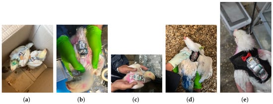 Various attachment methods are currently employed for attaching sensors to poultry. Backpack harnesses, primarily used around the wings, allow sensors to be fixed on the birds’ backs [13,14]. Smaller sensors like Radio Frequency Identification (RFID) tags are often attached to legs using elastic bands [16]. Non-stretching sport tape has also been used to affix sensor nodes to the abdominal skin of chickens [17]. However, attaching on-body sensors to broilers has its challenges. The rapid growth of broilers requires frequent readjustment of backpack harnesses, leading to increased handling and potential stress. Moreover, the combined weight of the sensor and attachment method should be minimized, with a recommended maximum of 3–5% of the bird’s body weight [18,19]. Additional concerns include potential discomfort, wing damage, and premature detachment of sensors. Despite the growing use of sensor technologies in poultry research, there is a lack of comprehensive studies comparing different attachment methods specifically for broilers. The body structure and rapid growth of broilers warrant a targeted approach to sensor attachment that balances data collection needs with animal welfare concerns.