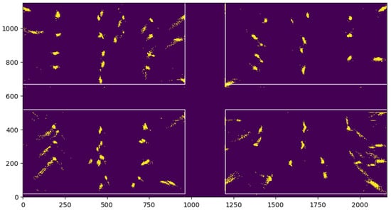 To analyze the noise of the UWB position estimation, TODO individual tags were placed on predetermined locations in the pen. Figure 4 plots the reported location of each of these static tags during 24 h, illustrating how the errors differ in the center of the pen versus at the edges of the covered area. Tags that are located close to the corners of the pen (i.e., close to the anchors) show a noise distribution in which the X and Y coordinates are correlated. Tags around the center of the pen show round shapes, indicating a smaller correlation between X and Y. This reflects the functioning of UWB localization, which solves a set of equations based on the time it takes for a signal to travel between the tag and the anchors, as described in Section 2.1. When a tag is close to the anchors, the crossing point of the hyperbolic curves drawn by each anchor is more difficult to compute, as the directions of the hyperboles are more similar to one another, causing the noise to have a hyperbolic-like shape. As such, animals in the center of the pen will have both lower errors on both X and Y coordinates. One way to remedy this in future experiments is to move the installed anchor nodes further away from the borders of the pen, thereby reducing the uncertainty (also referred to as the “dillution of precision”) of the position of the tags close the anchor nodes.