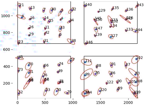 Frequency of measurement at each location in the four pens of the noise measurement experiment. Each colored blob corresponds to one UWB tag that was left on the ground for 24 h; the area size indicates the magnitude of the noise. The units of measurement on both the x-axis and y-axis are in centimeters.