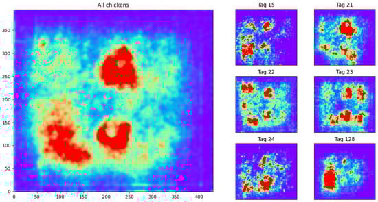 Histogram of activity measures at each location of the pen for each chicken. Red indicates higher values.