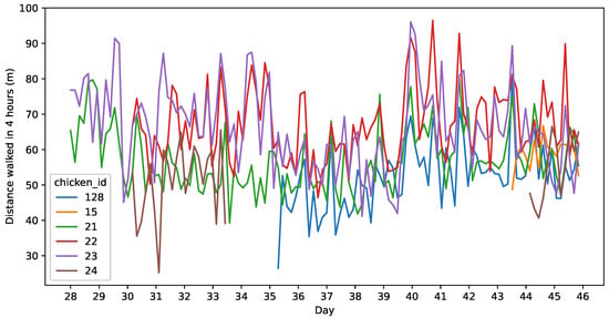 The UWB sensor allowed us to locate the chickens at all times. Unlike video-based approaches, UWB sensors do not depend on the lighting of the room and are robust to occlusions. Although modern video monitoring systems such as infrared and thermal imaging perform well in low-light conditions, they are less reliable for tracking individual animals in group settings and are more impacted by visual obstructions than UWB sensors. This highlights UWB as a very suitable technology for monitoring chickens continuously, both day and night and in high-density commercial settings where individual chickens are difficult to track in a video. Furthermore, it was possible to estimate the distance walked by each chicken based on the UWB locations, which further allowed us to identify differences in the distance walked by different chickens. This methodology has the potential of detecting health issues in chickens (in particular, lameness), when the distance walked by a chicken is significantly lower than that of other chickens, or of the same chicken in a previous period of time.