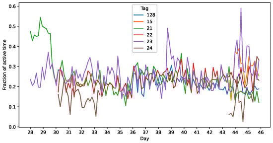 The study with the largest number of broilers conducted so far (280) was [4], which presented a statistical analysis of bird behavior. Accelerometers were used to measure the inactivity of the birds. The study characterized the typical inactive time as 78–80% of the day.