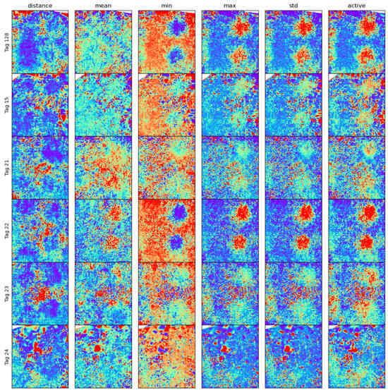 Figure 12 shows different statistical measures of the acceleration magnitude recorded, on average, at each location of the pen for each chicken. It can be observed that the maximum and standard deviation of the acceleration recorded are good indicators of the activity level. Furthermore, we can see higher activity levels around the feeders and the drinkers, although this pattern differs greatly between different chickens. Based on this histogram, it can be observed that even when broilers do not actively move to a different location, they can still exhibit high activities in their locality. This information would be lost when considering only position data.