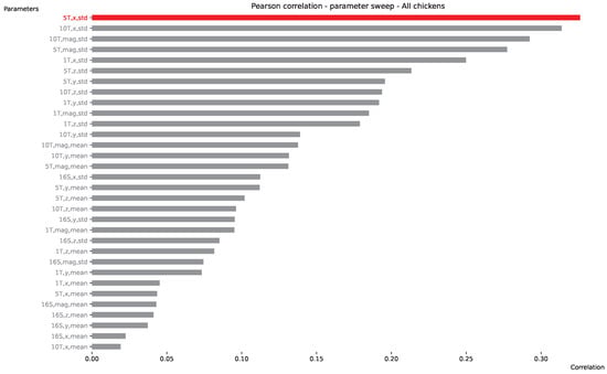 Since the cost of an IMU wearable is lower than the cost of IMU sensors, it is worth investigating if the movement of the animals could be estimated using the more low-cost sensors. To this end, here, we analyze the correlation between UWB movement and IMU data. With a high correlation (up to 1 or up to −1), we can estimate how much chickens physically move (which is not always equal to activity levels) based only on IMU sensor information, without relying on a high UWB update rate. With a low correlation, such a prediction would not be possible. Figure 13 presents such correlations with applied preprocessing. The labels on the y-axis denote these preprocessing steps (variables). The first variable (16S, 1T, 5T, 10T) indicates how much both UWB and IMU data are resampled (16 s or 1, 5, or 10 min). IMU information is always first resampled using an average of 1 s, and the resampling variable is denoted on the y-axis label. The second variable corresponds to which axis of the IMU data is used for resampling. UWB always calculates the traveled (Euclidean) distance over the aforementioned resampling period. The last variable indicates whether the mean or standard deviation (std) of the IMU data is used for resampling. Once both IMU and UWB data are resampled to the same time window (using the preprocessing steps mentioned above), a Pearson correlation is measured between the two. As a result, the highest correlation (0.33) is obtained for all chickens using a (IMU) resampling period of 5 min, the IMU x-axis, and the standard deviation. Interestingly, a longer window of 10 min yields only a slightly lower correlation, while the magnitude of the IMU signal sits just behind, on the third and fourth highest correlations. Lower resampling periods (16 s, matching the default UWB update rate) yield very poor correlations. Although the highest correlation is not near 1 (or −1), clearly, some correlation can be found, indicating that IMU data can be viable (when using the standard deviation over a long period) to indicate whether the chicken has moved in space or sat still.