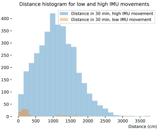The energy consumption of transmitting a UWB packet for localization is significantly higher than the local storage of sensor data using on-chip memory. As such, intelligently sending localization packets can significantly increase battery lifetime and/or reduce the weight of the wearable. Here, we analyze the IMU activity for chickens not physically moving through the pen (traveling at least distance X). This will indicate whether it is possible to trigger UWB localization only when the chicken is moving based on IMU activity data. The hypothesis is that we can differentiate the positional movement versus stationary movement of the chicken using IMU sensors. Figure 14 shows the distribution of distances traveled by all chickens in 30 min. The distance distribution is shown for IMU sensors that had low or high movements, orange and blue, respectively. The IMU data (magnitude) are grouped by the sum of standard deviation values of 1 s over half an hour. The UWB data are calculated by grouping the sum of distances over half an hour. Low IMU movements (experimentally derived based on the lower side of the IMU distribution) had movements lower than 5 m in half an hour. If a threshold is set based on the sum of IMU movement in half an hour, a high accuracy (i.e., the chickens start moving in space) will be achieved with only a few false-negative movements, enabling the UWB to sleep until IMU movement is detected.