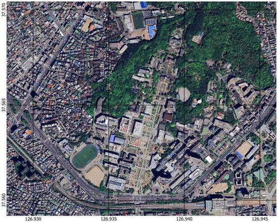 Data from Seoul, South Korea’s Yeonhui-dong neighborhood, and the Sinchon campus of Yonsei University were used in this study. The geographical layout of the study area is depicted in Figure 1, which also highlights the major landmarks and areas of interest examined in this study. This area was selected because of its varied urban features, which make it the perfect place for testing and validating the proposed 3D mapping framework. The research site is representative of a typical dense urban setting as it covers an area of approximately 1.28 km² and includes various building types, road networks, and topographical features.