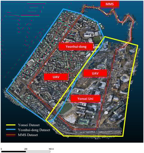 To support our UAV imagery for full urban mapping and analysis, we gathered high-density point cloud data and street-view images using a Pegasus Leica MMS. This acquisition focused on the Yonsei University campus and Yeonhui-dong area and collected fine ground details from street level. Using the Pegasus Leica system for approximately 1 h, we accumulated a large dataset with approximately 480 million points from a road distance of 3.7 km. This dataset covers not only structural details but also important geographical features, allowing for a comprehensive and integrated perspective of the environment.