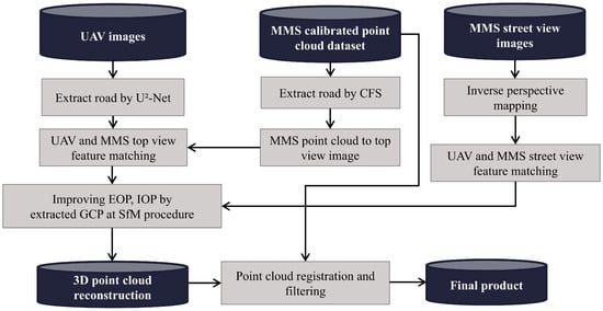 Subsequently, a 3D point cloud was reconstructed from the UAV images using enhanced orientation parameters. The MMS point cloud was then registered and filtered against the reconstructed UAV point cloud to ensure proper alignment and noise reduction. Following the registration and filtering processes, a refined 3D point cloud model was created and used as the final product for analysis. Figure 3 illustrates the flow of this research.