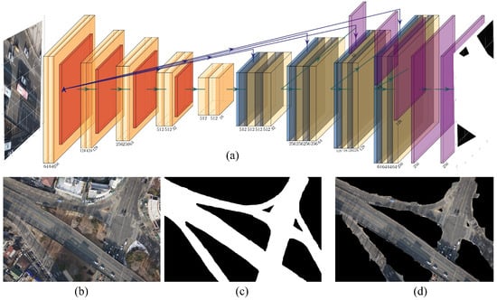 (a) Model structure based on U2net, (b), UAV image, (c) ground truth, (d) result of road segmentation.