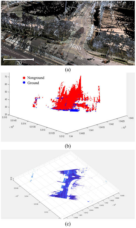 CFS results. (a) MMS point cloud, (b) segmented point cloud, and (c) ground point cloud.