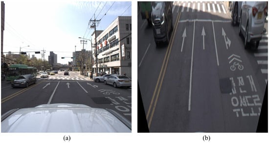 To compute the inverse perspective mapping, we assumed a flat ground plane at a fixed height (for example ) in the real world. Under this assumption, we can express the mapping as shown in Equation (15):