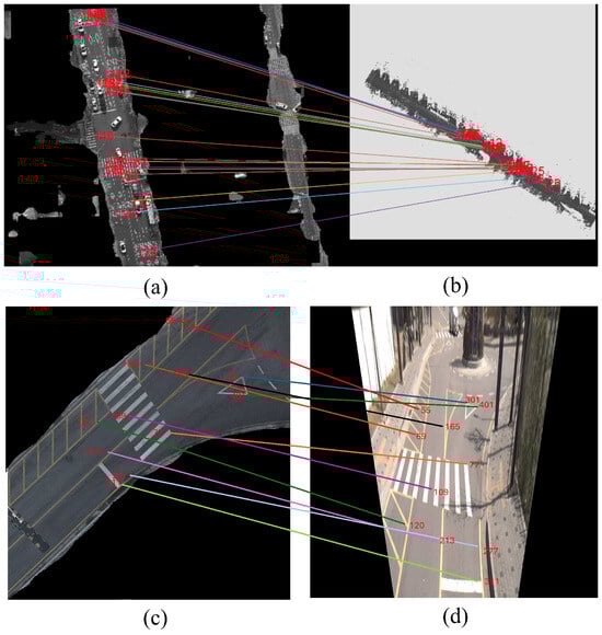 It was thus important, to begin with the initial step of road segmentation using U²-Net on UAV imagery in conjunction with CSF to isolate ground-level features in the MMS data and to set a solid, road-based foundation for the alignment. The road features acted as continuous and trustworthy features in both datasets, ensuring that the main urban structures are emphasized in both the UAV and MMS data. Converting the MMS point cloud data into a 2D top-view intensity image and performing IPM on the MMS street-view images allowed both datasets to share a common overhead perspective, simplifying the cross-view comparisons. Feature matching was performed using LightGlue, which further enforced alignment using attention mechanisms that adaptively considered both scale and perspective differences. Unlike many feature-matching approaches, LightGlue effectively handles the variability between data from UAV and MMS, thereby enhancing the robustness of the feature alignment.
