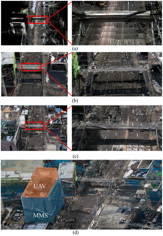 Notably, using MMS-derived GCPs as an alternative to traditional GNSS-based techniques improves the proposed framework’s practicality and cost-effectiveness, particularly in metropolitan areas with restricted GNSS access. Automated and hierarchical integration of aerial and ground-level datasets reduces the need for manual intervention while preserving high accuracy and spatial coherence.