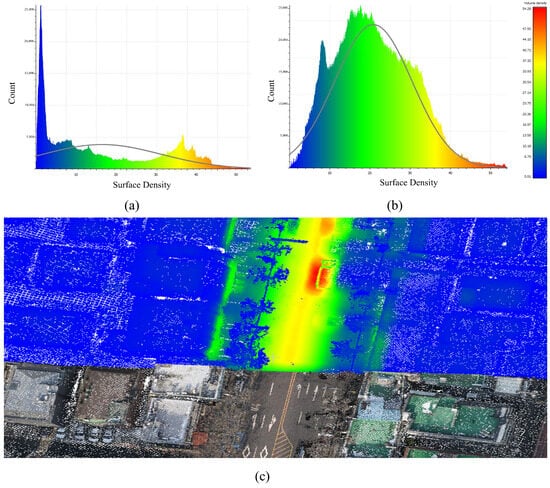 Mathematically, let represent a grid cell at position in the 2D plane. The density , average height , and normalized intensity are calculated as Equations (9)–(11):