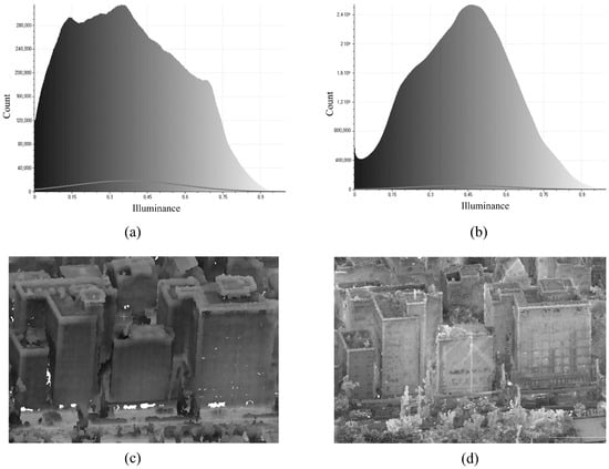 (a) Illuminance distribution of the UAV-generated point cloud, (b) illuminance distribution of the integrated point cloud, (c,d) showcases of illumination for the UAV-generated and integrated point clouds, respectively.