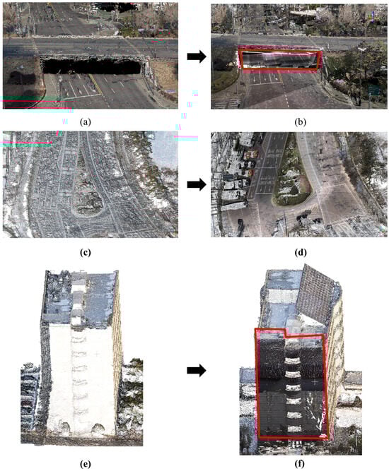 The original and integrated datasets were overlayed to conduct a Qualitative visual assessment of the point clouds. This approach allowed for a recognition of enhancements in detail and spatial coherence. Smoother transitions, clearer definitions of structural parts, and more full representations of urban features were all seen in the combined dataset. Notably, the integration of UAV and MMS data increased the completeness of places such as roads and underpasses, as well as the building façade near roadways, where MMS data are highly accurate. Figure 13 shows the improvements: Figure 13a,b exhibit the underpass case, Figure 13c,d depict the road case, and Figure 13e,f show the building façade case. The red boxes in the photos represent MMS areas added to the low-cost UAV-generated point cloud, highlighting the suggested method’s improved detail and spatial coverage.