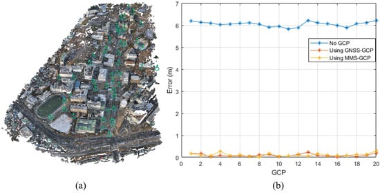(a) GCP locations from GNSS, (b) Geolocation accuracy comparison.