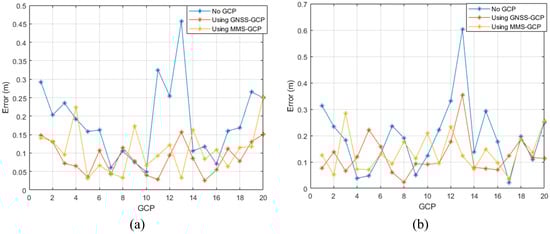 Figure 14 shows the geolocation accuracy of the three configurations. The results suggest that the configuration using GNSS-based GCPs yielded the lowest RMSE, followed closely by the configuration that used MMS-extracted GCPs. The RMSE values for X, Y, and Z for each configuration are summarized in Table 3. We can also see that the MMS-GCP configuration had the highest inaccuracy with an RMSE of 0.1311 m, whereas the GNSS-GCP configuration yielded an RMSE of 0.1121 m. In contrast, the basic configuration without GCPs yielded an RMSE of 6.0528 m, indicating that the presence of GCPs, particularly those that have been extracted from the MMS data, increases considerably the attained accuracy.