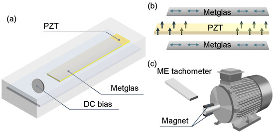 14], offering advantages such as high sensitivity, fast response, and good stability. When applied to tachometers for non-contact measurement, these composites can significantly improve durability and reliability. In contrast, traditional mechanical tachometers rely on components such as gears and bearings, which wear out over time. In extreme temperatures and high-vibration environments, this wear becomes even more severe, leading to measurement errors, reduced sensitivity, and a shortened lifespan. Due to the unique non-contact working principle, which relies on the magnetostrictive and piezoelectric effects, ME composites can maintain stable operation across a much wider temperature range compared to traditional tachometers. Non-contact measurement improves performance stability, especially in complex environments involving extreme temperatures, high vibrations, and harsh industrial conditions. Furthermore, the main components of the ME tachometer are PZT ceramics and Metglas alloys, both of which are cost-effective. The simple composition and structure are advantageous for large-scale manufacturing and widespread applications.